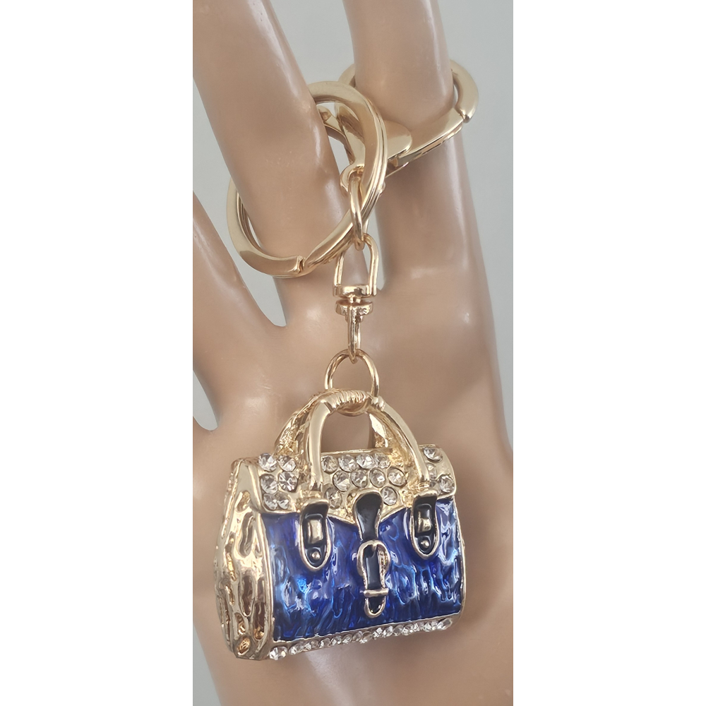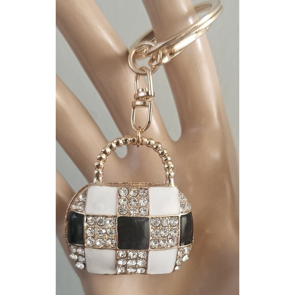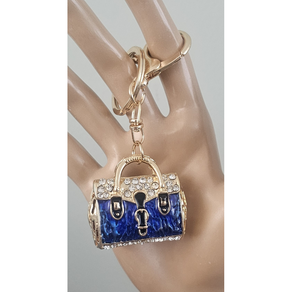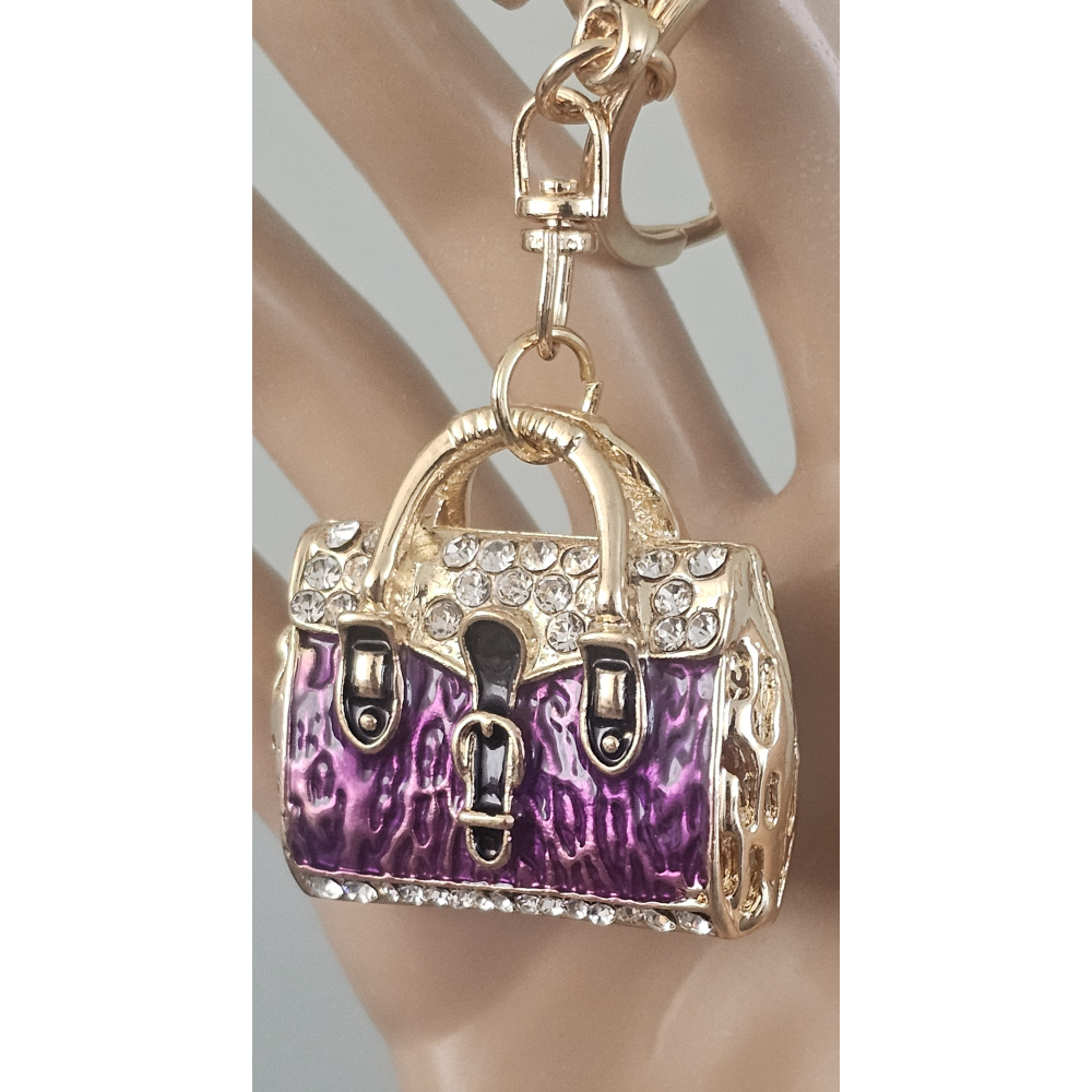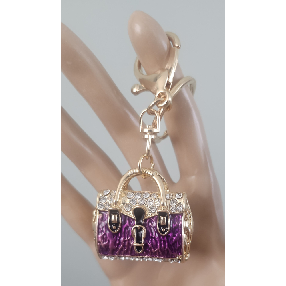 Deze handtas sleutelhanger is te bestellen in blauw, paars, wit, zwart/wit, rood.