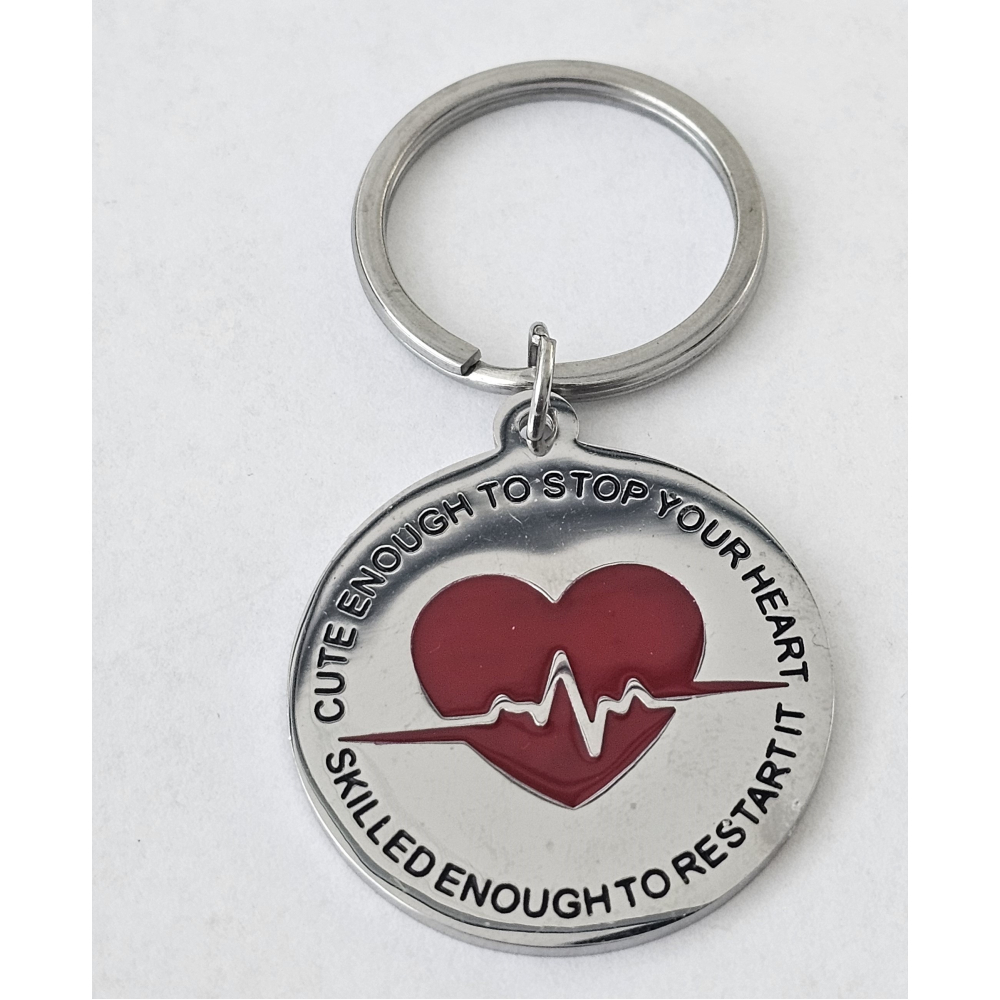 Sleutelhanger met de tekst "CUTE ENOUGH TO STOP YOUR HEART, SKILLED ENOUGH TO RESTART IT"