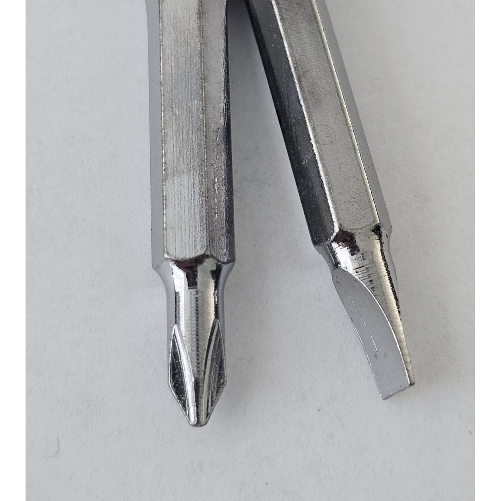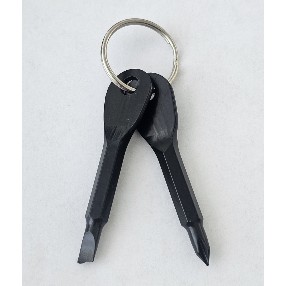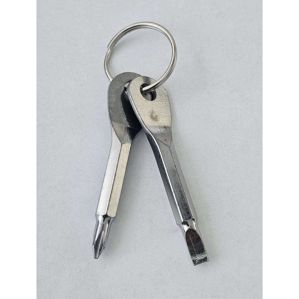 Sleutelhanger die bestaat uit een platte schroevendraaier en een kruiskop schroevendraaier.